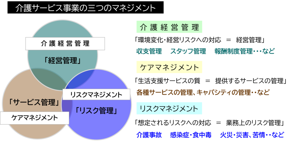介護サービス事業は、「経営マネジメント」「リスクマネジメント」「ケアマネジメント」という三つのマネジメントできている。経営マネジメントは、収支管理だけでなく、介護医療などの制度変更リスクや地域特性の理解、他事業者との連携なども含む。リスクマネジメントは、介護現場を守るための事故やトラブル対応、感染症や災害対策、入所者・利用者選定、家族との信頼関係の醸成など多岐にわたる。個別のケアマネジメントは、ケアマネジャーの仕事だが、ここでいう管理者のケアマネジメントは、サービス向上や介護スタッフの過不足の見極めなどを含めた全体のサービス管理を含む概念だ。
